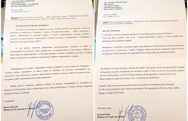 “I would like to extend the support of the Ministry of Youth and Sports towards this project as its main focus is to find ways to analyze, strategize, market and promote appropriate practices for the development of sports programs and organizations across Europe and other partnering countries. The Ministry of Youth and Sports considers the project’s main goals, such as the improvement in training of leadership and staff, strengthening the data base in order to come up with the best possible programs, policies and procedures, as well as creating awareness of the importance of physical activity and Sports among the youth, just to name a few, to be among our top priorities” - Minister Krasen Kralev says in his letter of support, wishing success and measurable added value of the project activities.