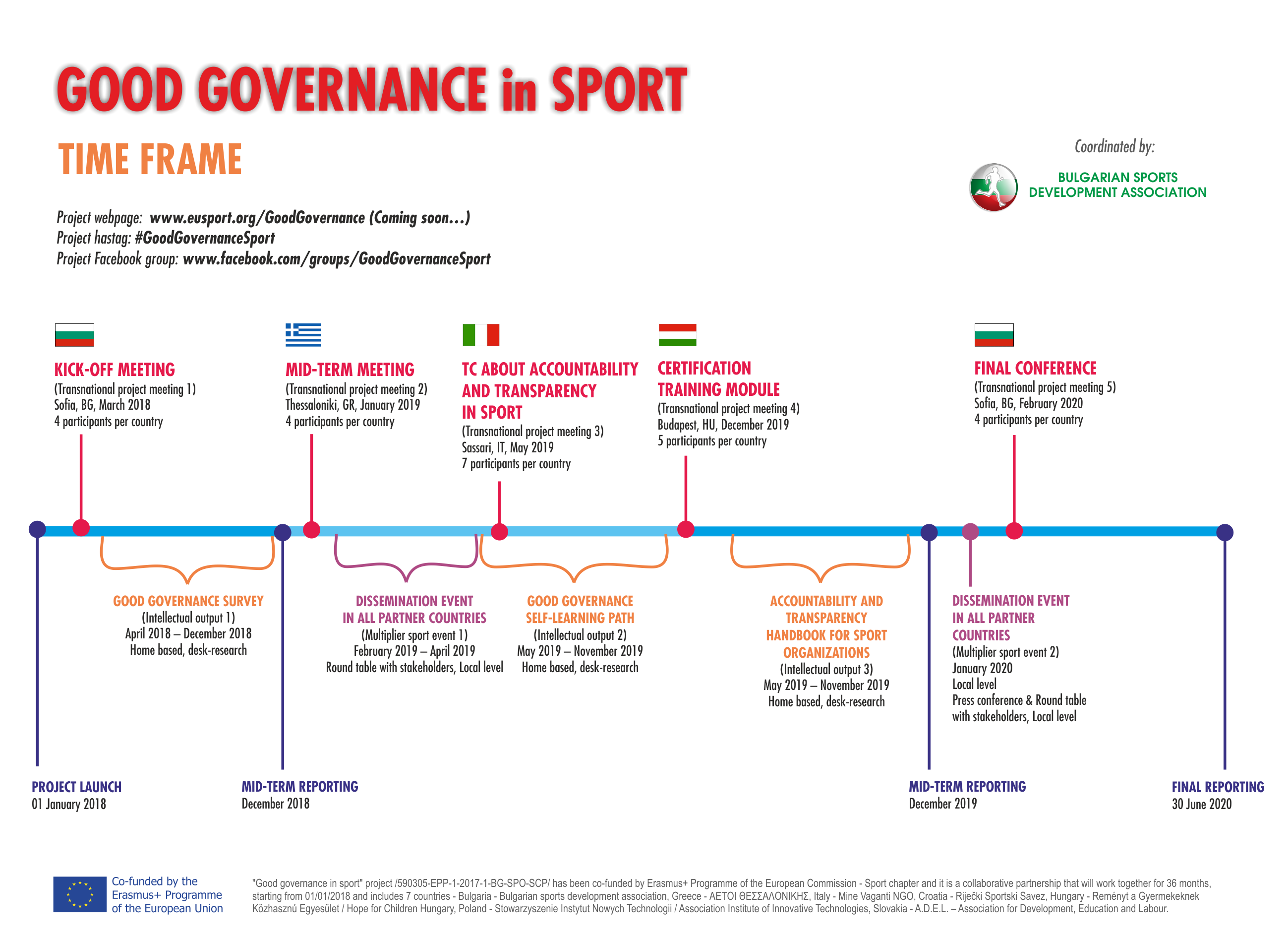 "Good governance in sport" project has been co-funded by Erasmus+ Programme of the European Commission - Sport chapter and it is a collaborative partnership that will work together for 36 months, starting from 01/01/2018 and includes 7 countries - Bulgaria - Bulgarian sports development association, Greece - ΑΕΤΟΙ ΘΕΣΣΑΛΟΝΙΚΗΣ, Italy - Mine Vaganti NGO, Croatia - Riječki Sportski Savez, Hungary - Reményt a Gyermekeknek Közhasznú Egyesület / Hope for Children Hungary, Poland - Stowarzyszenie Instytut Nowych Technologii / Association Institute of Innovative Technologies, Slovakia - A.D.E.L. – Association for Development, Education and Labor.